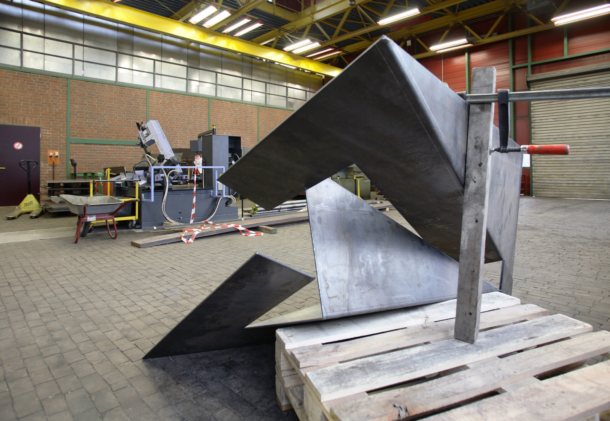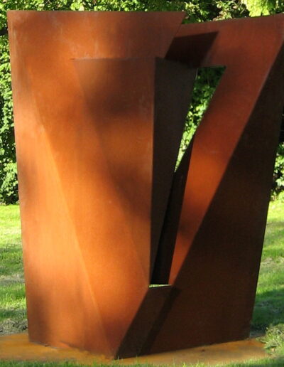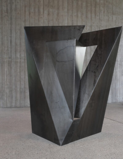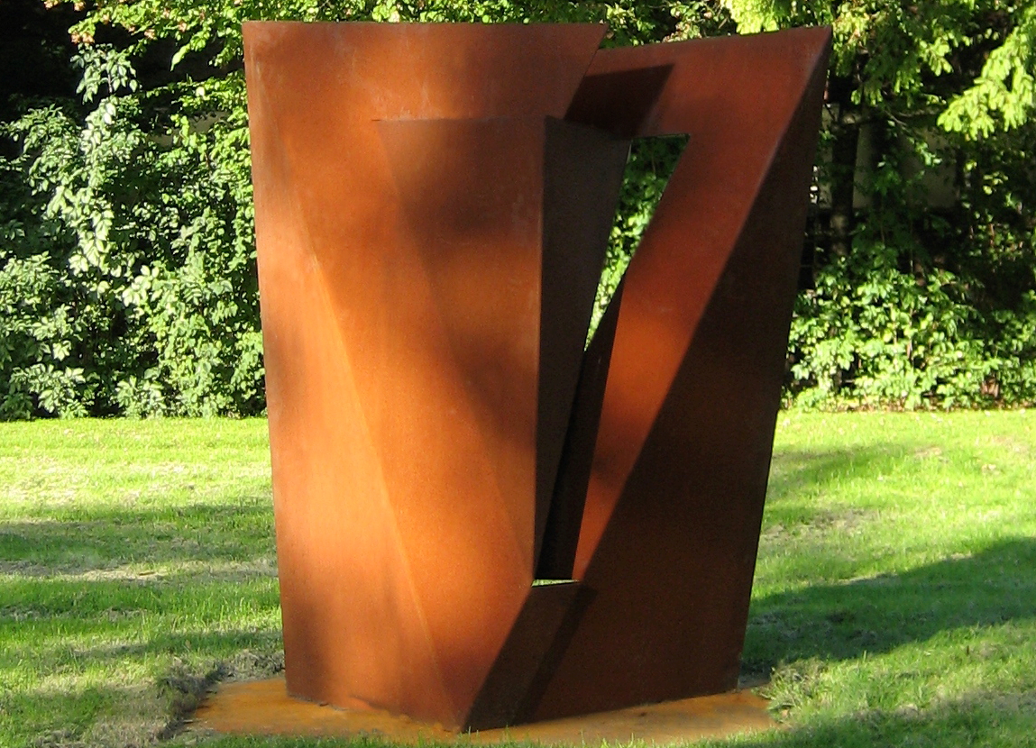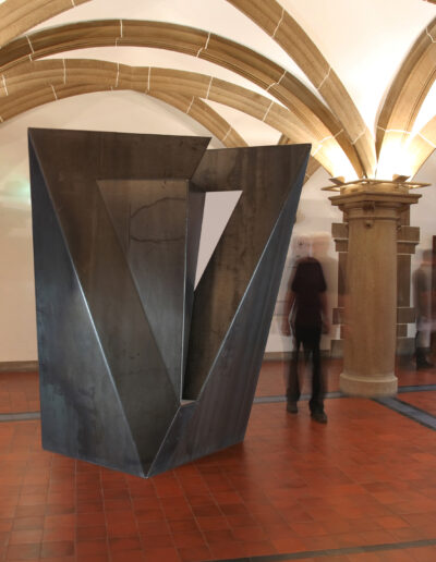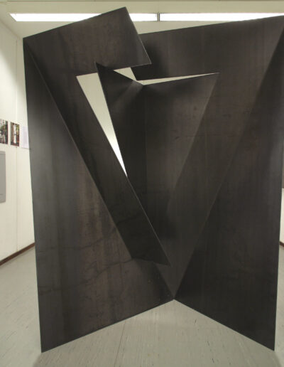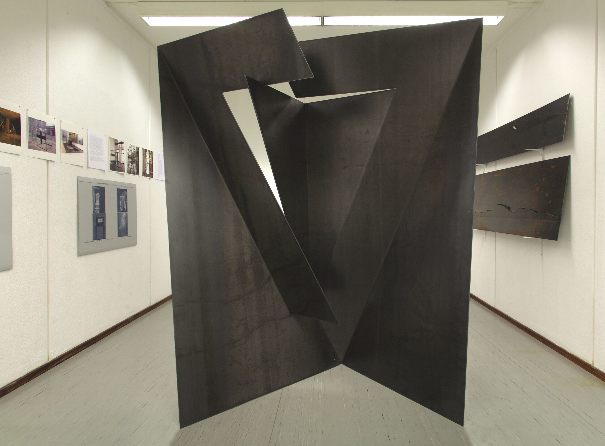 Die freistehende sockellose Stahlplastik ist aus einem quadratischen Schwarzblech entwickelt, dessen zweidimensionale Fläche durch Einschnitte und Faltungen ohne Hinzufügen oder Wegnehmen von Material in einen dreidimensionalen Körper verwandelt ist.