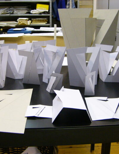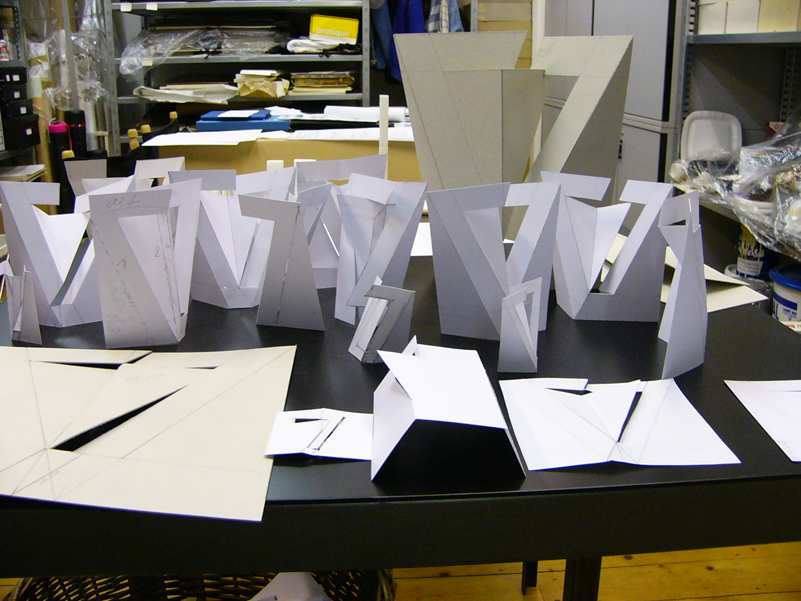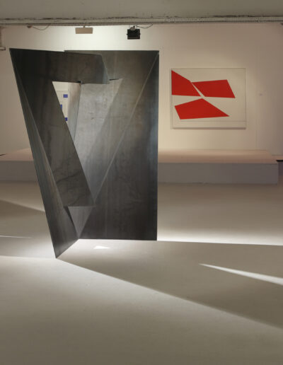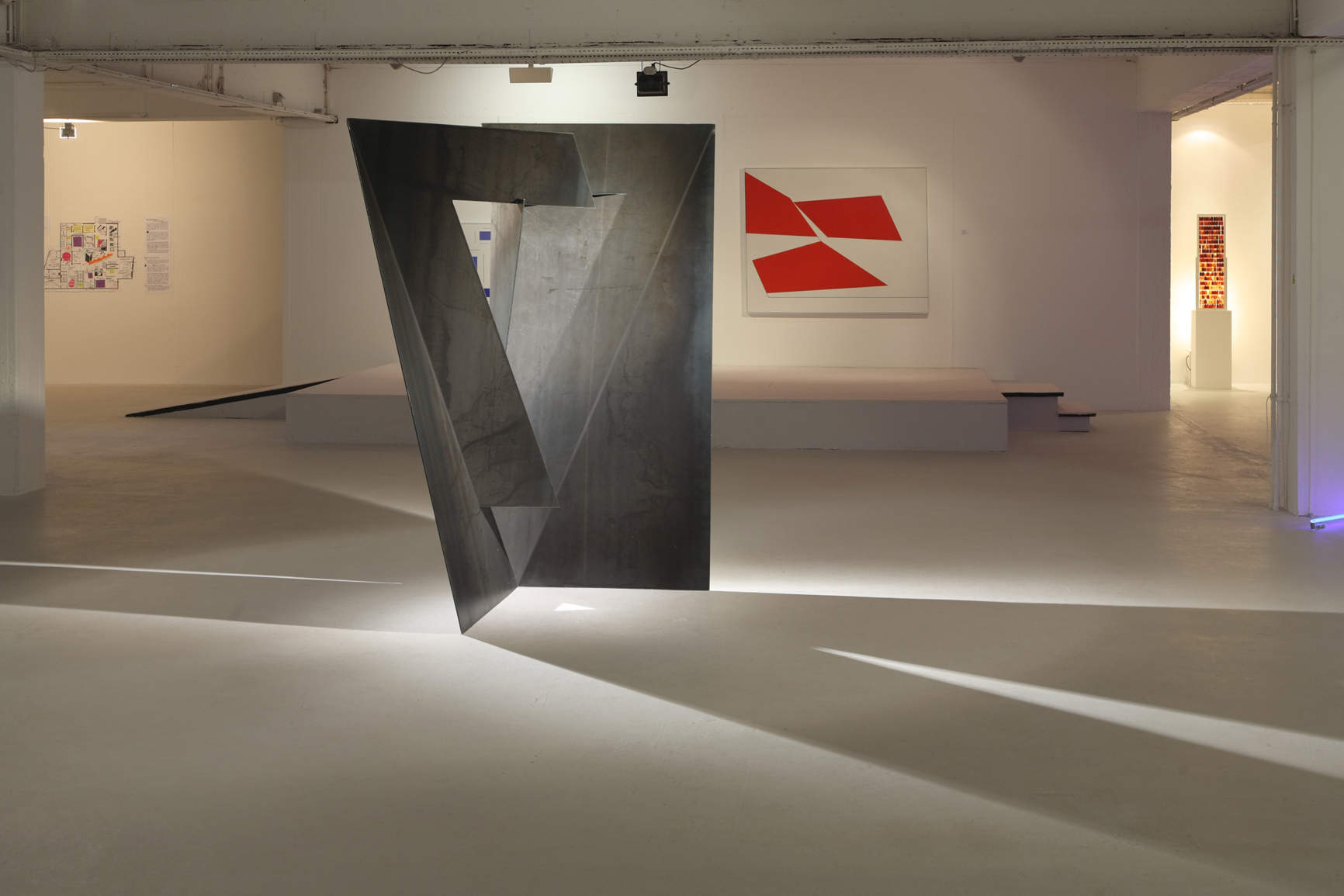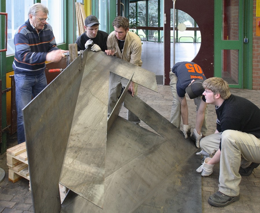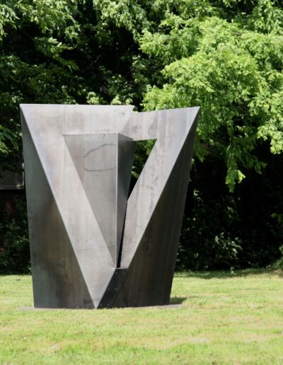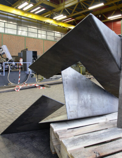 Die freistehende sockellose Stahlplastik ist aus einem quadratischen Schwarzblech entwickelt, dessen zweidimensionale Fläche durch Einschnitte und Faltungen ohne Hinzufügen oder Wegnehmen von Material in einen dreidimensionalen Körper verwandelt ist.
