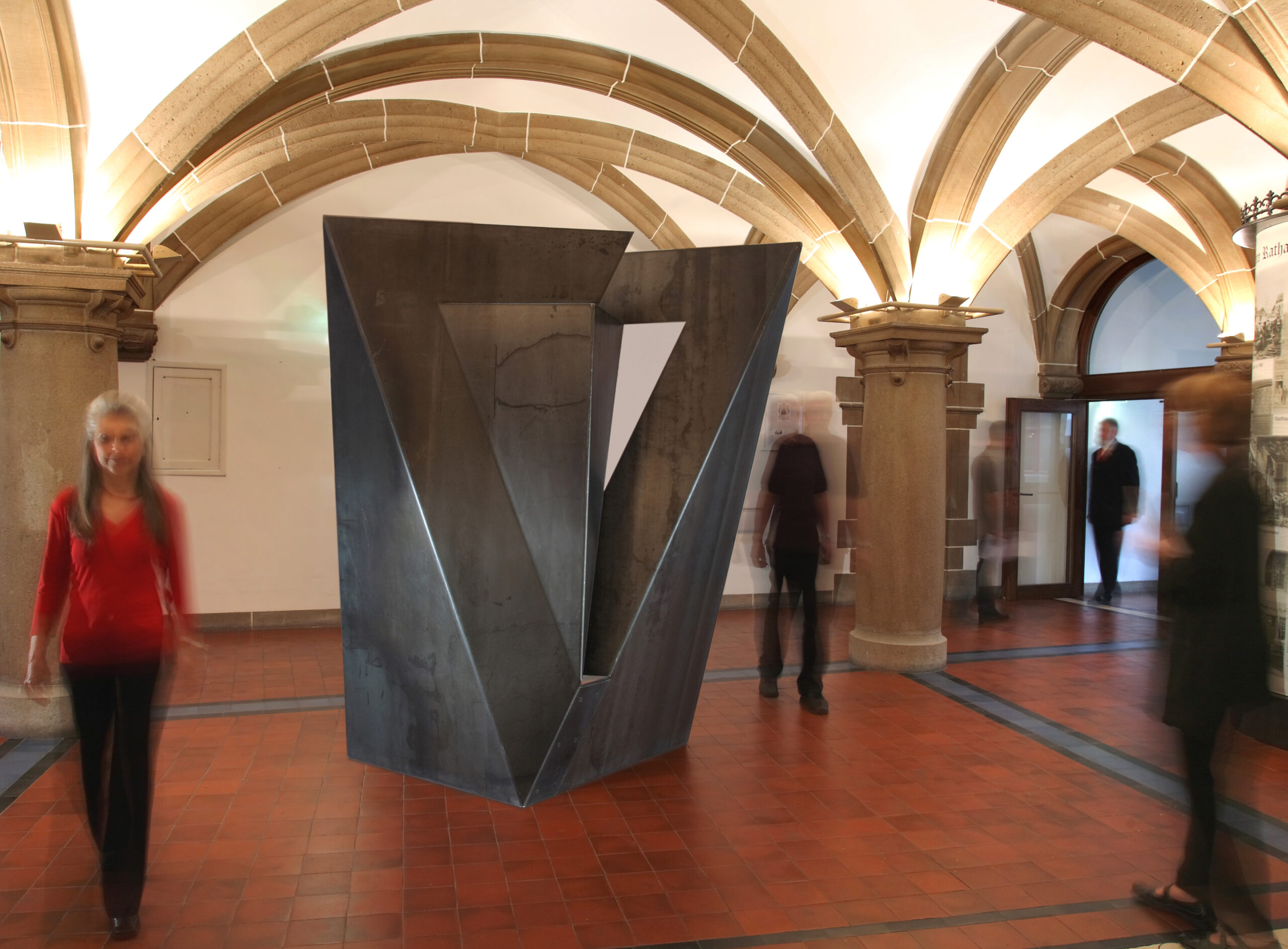 Die Reise der Stahlskulptur SIGNUM durch unsere Stadt hat im Januar 2008 begonnen und im Sommer 2009 unter dem Gesichtspunkt „Vergänglichkeit» ihren Abschluss gefunden. Besonders gut erinnere ich mich an die Präsentation im Duisburger Rathaus im Frühjahr 2008, die ich persönlich als sehr eindringlich und berührend empfand. Ein „Fremdkörper» hatte in unserem alten, denkmalgeschützten Rathaus Einzug gehalten und trat in einen spannenden Dialog mit seinem historischen Umfeld. Der Spannungsbogen zwischen der mächtigen, damals noch tiefschwarzen Skulptur und ihrem Aufstellungsort war überdeutlich zu spüren.